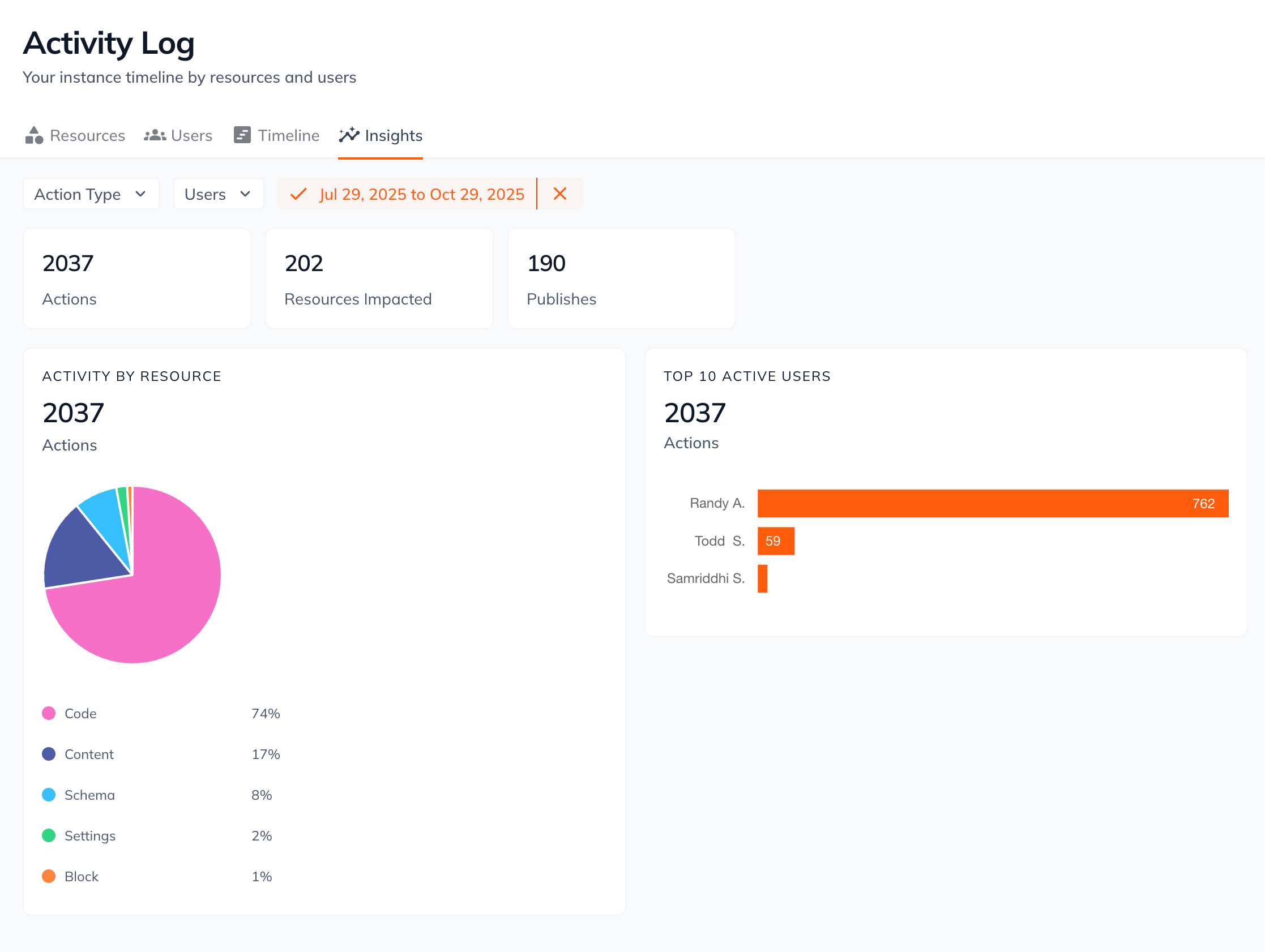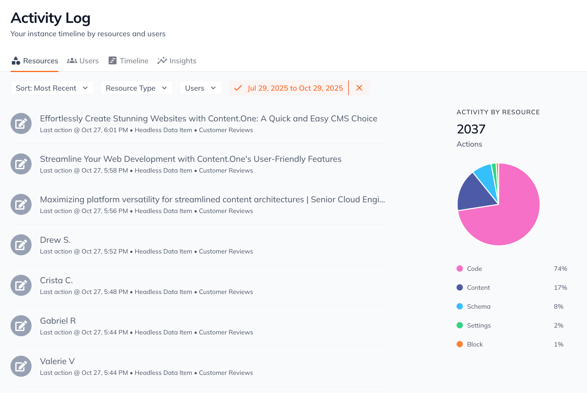 Full activity logs span content entries, templates, media assets, and user permissions. Filter changes in seconds and surface the exact revision you need.